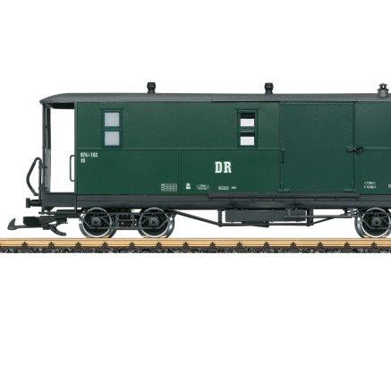 Passend zur Epoche der Dampflokomotive VII K rollt ein Gepäckwagen der DR aufs LGB-Gleis. Wagennummer ist die 974-102.