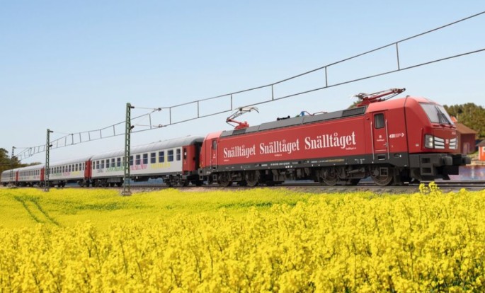 Gezogen von einem Mehrsystem-Vectron steht der Reise keine Systemgrenze im Weg. Der Zug besteht aus einer Lokomotibe im Snälltaget-Design (88238)und vier reisezugwagen des Typs Bmpz (87283).