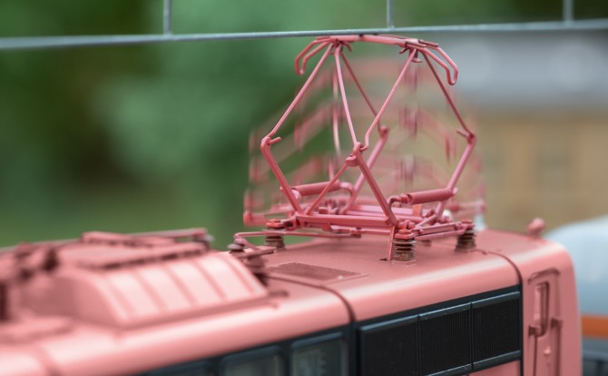 Das H0 Modell besitzt einen schaltbare Anfahrlampe und heb- bzw. senkbare Stromabnehmer.