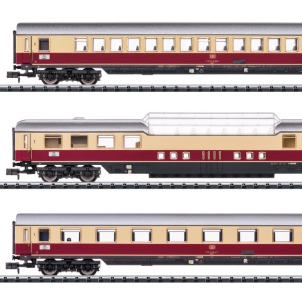 Das 3-teilige Wagenset mit dem Dome-Car / Aussichtswagen bildet den ersten Teil des Rheinpfeils. In TEE-Lackierung wohl die beliebteste Version dieses bekannten Zuglaufes von Dortmund nach München.